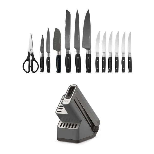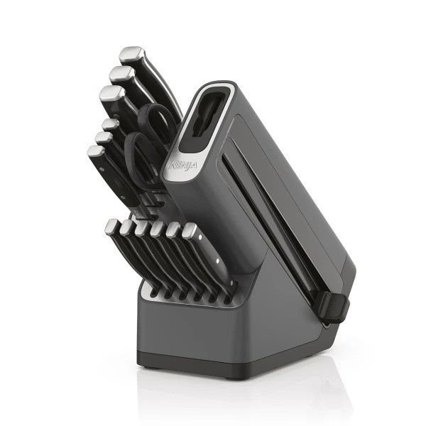 Predstavljamo vam Deluxe izdanje Ninja Foodi StaySharp noževa. Ovaj set koji broji ukupno 14 komada, uključuje 12 osnovnih kuvarskih noževa, specijalno drveno postolje sa ugrađenim oštračem i par kuvarskih makaza. Ovi noževi su napravljeni da traju, izrađeni su od kovanog nemačkog nerđajućeg čelika sa preciznim oštricama. Ninja Foodi StaySharp set noževa savršen je za iskusne kuvarе, kao i početnike u kuhinji.